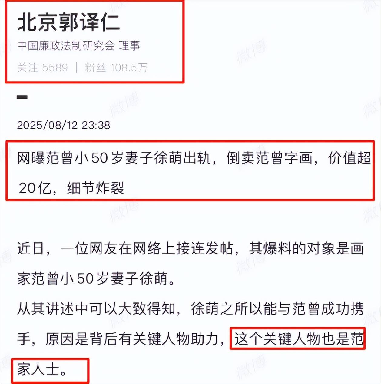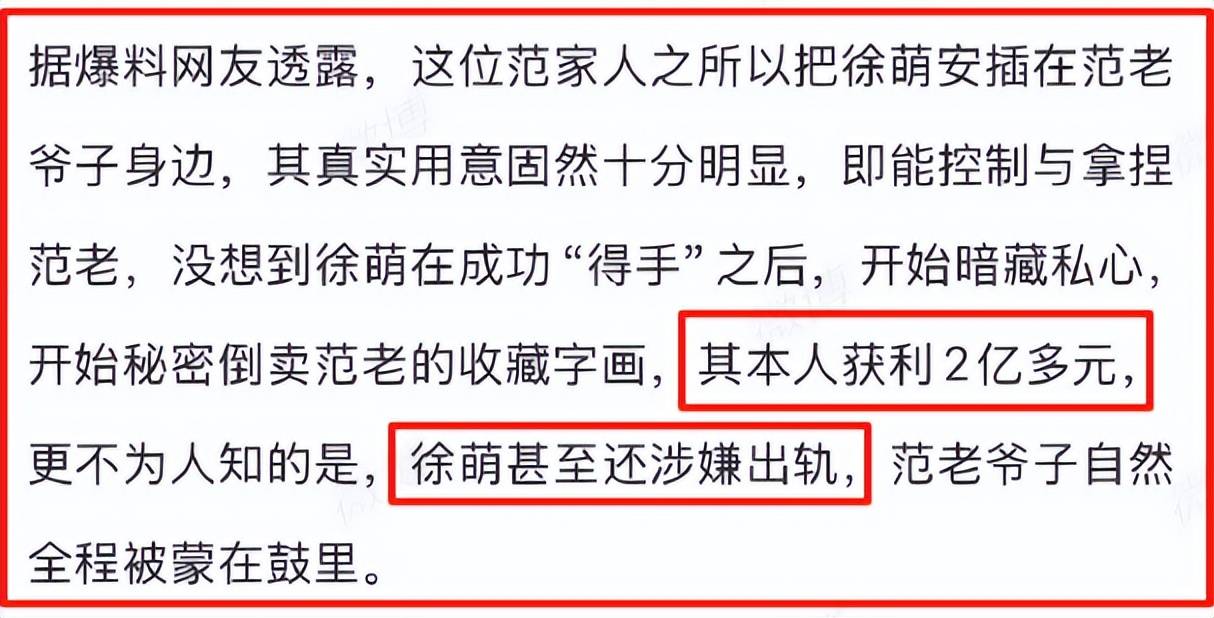 爆料人说,徐萌和范曾结婚后,一直在偷偷售卖他的字画和收藏。