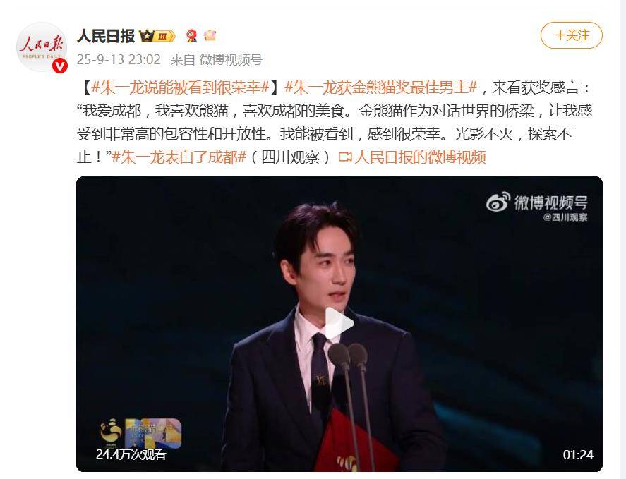 2025年9月13日,朱一龙凭借在电影《河边的错误》中饰演刑警马哲一角,成功摘得金熊猫奖电影单元最佳男主角桂冠。这不仅是他个人生涯的第9座影帝奖杯,更一举让他成为85后男演员中首位集齐金鸡奖、百花奖和金熊猫奖三大重量级奖项的“大满贯得主”。网友纷纷感叹:“这是他应得的!”