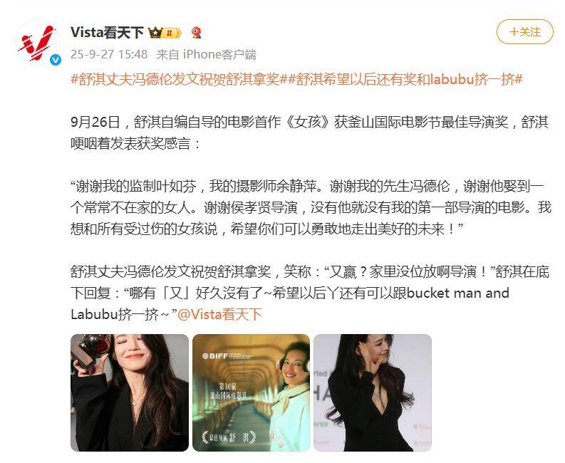 冯德伦一句“又赢?家里没位放啊导演!”的调侃,瞬间让舒淇拿下釜山电影节最佳导演奖的消息添了几分烟火气的甜。这条社交动态配上舒淇手捧奖杯的灿烂笑容,看似吐槽,实则暗藏夫妻俩独有的默契与骄傲——毕竟,能凡尔赛到“奖杯多到没处放”的,娱乐圈可没几对。