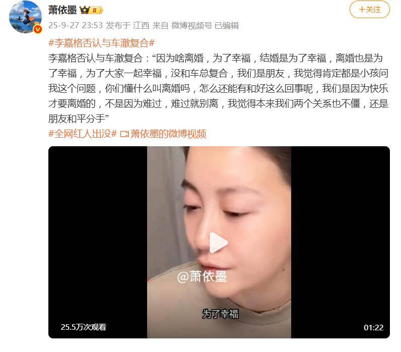 一句“没复合,还是朋友”,让李嘉格再次成为舆论焦点。9月27日,有网友爆料,李嘉格在直播中直接回应了与车澈复婚的传闻,用一套“幸福逻辑”干脆利落地斩断外界猜测,被网友评价为“离婚冷静期宣传大使”。