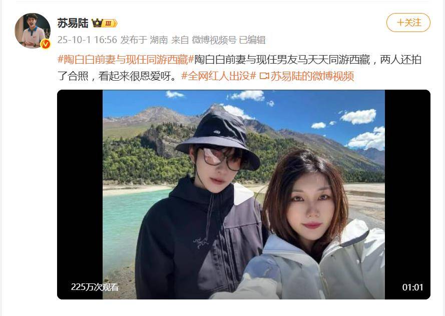 10月1日,陶白白前妻鹿角(本名卢娇)与现任男友马天天共同现身西藏旅行的照片曝光,两人亲密合照互动自然,直接打破了此前“分手”传闻,也让这段一度充满争议的恋情再度成为舆论焦点。